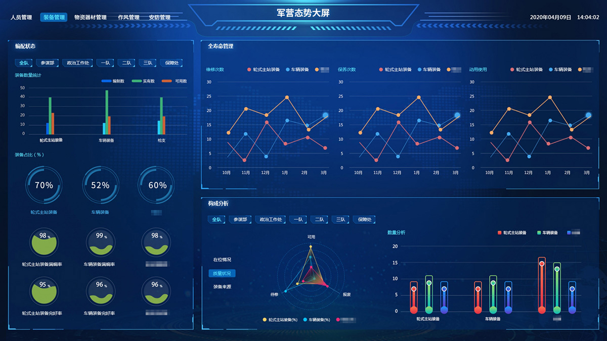 綜合保障系統(tǒng)依托物聯(lián)網(wǎng)、RFID識別和傳感技術(shù),著眼作戰(zhàn)精準(zhǔn)保障、戰(zhàn)備常態(tài)保障和官兵生活保障,對戰(zhàn)備物資、裝備器材、營房物資和被裝物資等的全生命周期的電子化管理,對官兵的健康實(shí)時監(jiān)護(hù)。包含財務(wù)管理、軍需油運(yùn)、武器裝備、衛(wèi)勤管理、營房管理模塊。確保部隊出動,車輛給養(yǎng)油料跟得上,裝備維護(hù)情況實(shí)時掌握,營房管理工作平時與戰(zhàn)備同步推進(jìn)。