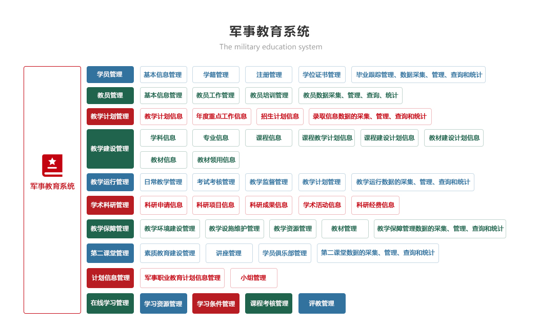 包括訓(xùn)練計劃、訓(xùn)練檢查、訓(xùn)練考核、訓(xùn)練檔案、訓(xùn)練資源模塊,實(shí)現(xiàn)對訓(xùn)練計劃制定情況自動統(tǒng)計和智能分析、逐步解決訓(xùn)練時間、訓(xùn)練人員落實(shí)情況、實(shí)現(xiàn)智能報靶和體能訓(xùn)練監(jiān)測、實(shí)現(xiàn)網(wǎng)上模擬訓(xùn)練與考核的智能化、自動化和便捷化,對訓(xùn)練資源科學(xué)管理,確保為軍事訓(xùn)練工作有力支撐。